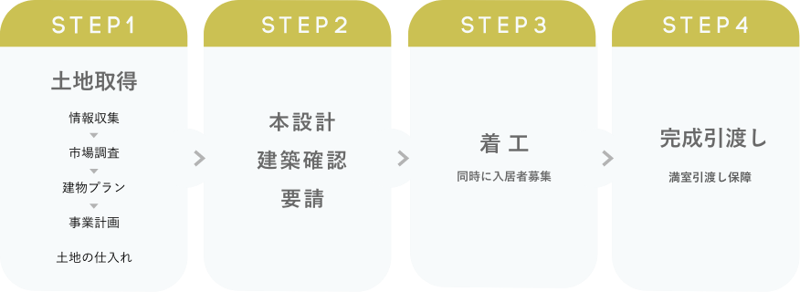 - 所定の賃貸契約を済ませた借受人の入居がスタートします。 ご希望のオーナー様には、共用部分の清掃などのメンテナンス・家賃の回収などの管理業務の委託を弊社にて承ります。